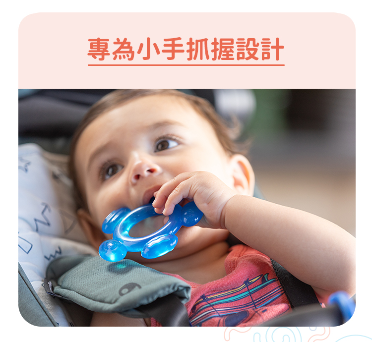 ✅圓圈造型,小手靈活抓握,五個顆粒不同紋理,讓前齒已經開始發展的寶寶能感受不同的刺激與按摩