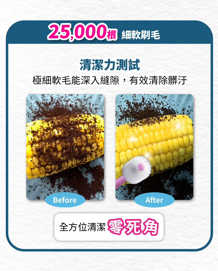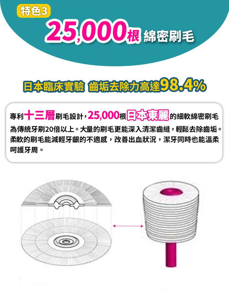 25,000 根,大量綿密刷毛,更能深入清潔齒縫,齒垢去除力高達98.4%